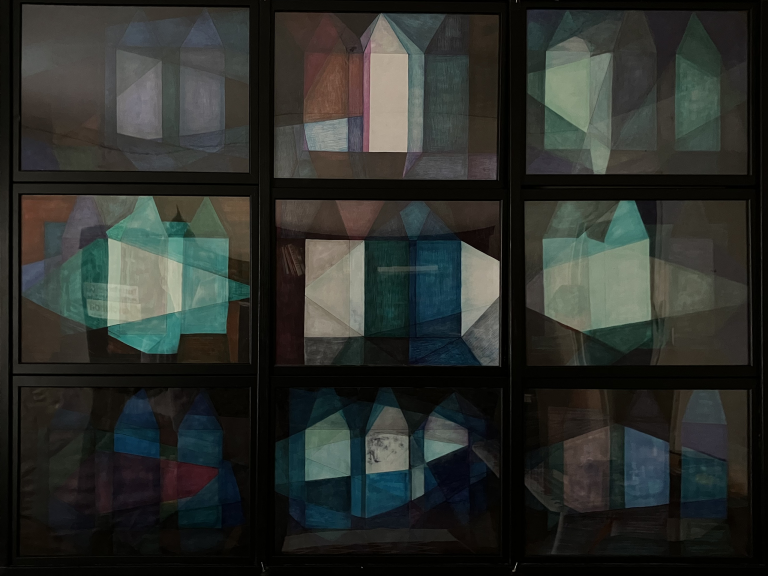 Ink paintings colored with Copic markers BG11, BG45, BV13, B69, B66, YR09, E93, N0, N2, N4, N7, N9, 100 and 4 colored Bic ink pens. The basic pattern is made with a 003 (0.15 mm) Micron pen, on a Winsor and Newton 160g/m2 heavy weight bleedproof paper. The paintings are made of nine colored sheets of paper that are individually framed and then assembled with an outer stronger frame. The finished composition measures 1250 x 950 mm.